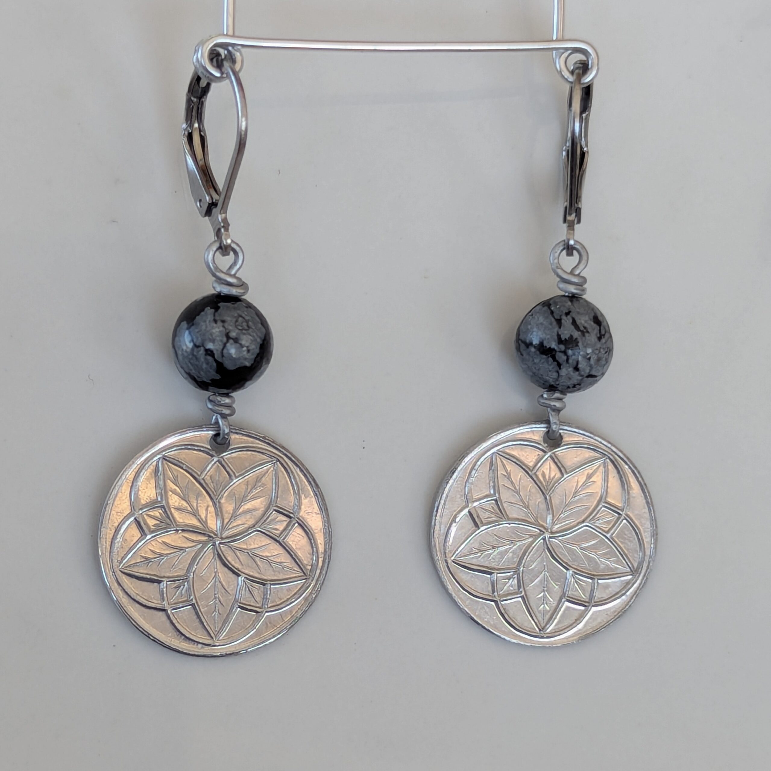 Hand struck aluminum earrings with gem beads on surgical steel leaver backs. 19-20mm wide x 52mm long.