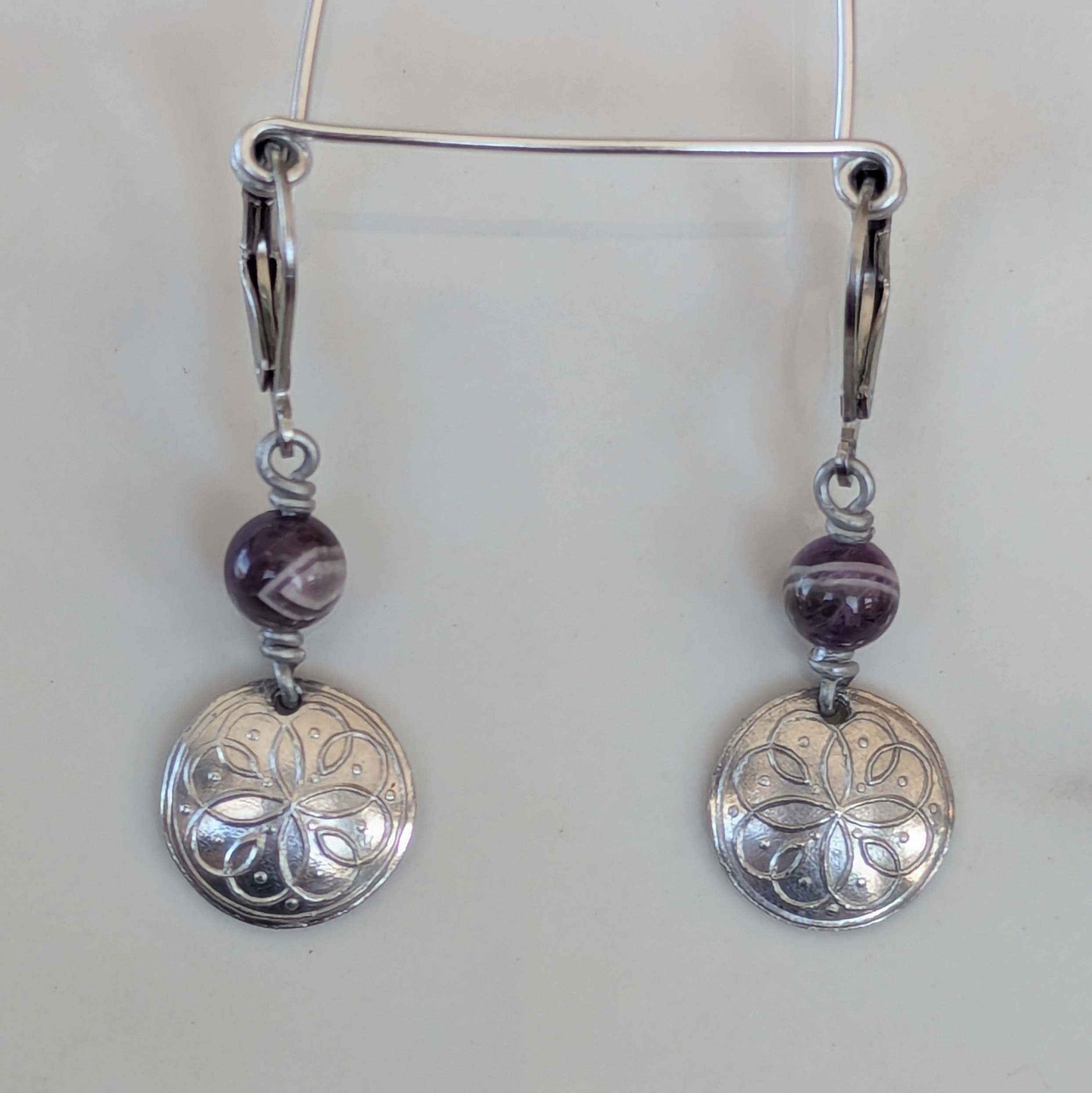 Hand struck aluminum earrings with gem beads on surgical steel leaver backs. 13mm wide x 40mm long.